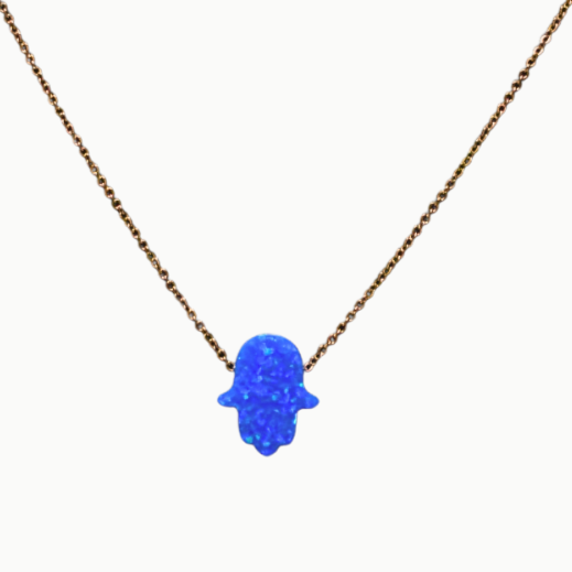 Description: Blue hamsa pendant with gold cable chain. Waterproof and tarnish free.